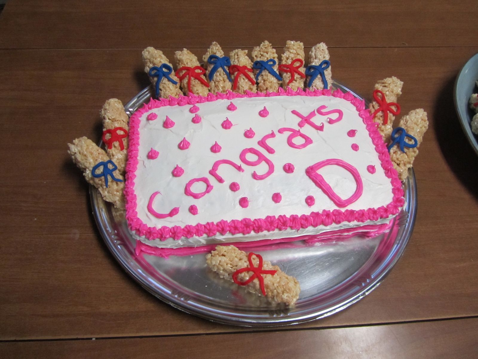 | And here is the other one! It's two 8" circles with a 9"x9" square on top. And then all the little cereal treat diplomas around it. |